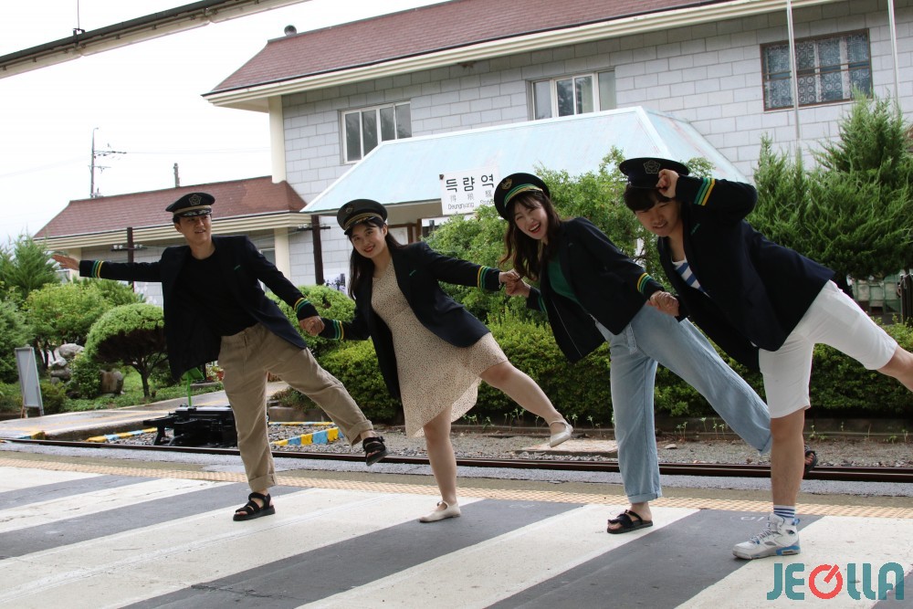 11일 보성군 득량 추억의 거리를 방문한 대학생들이 역무원 의상을 입고 70년대로의 시간 여행을 즐기고 있다.